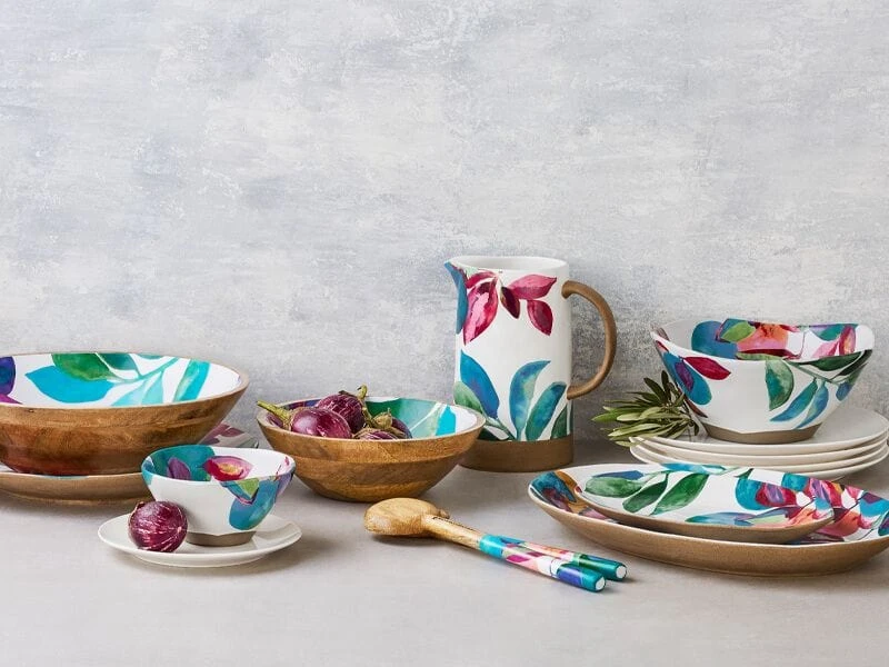 Samba’s versatile range of serving ware includes a selection of organic shapes with a fresh, lively aesthetic. With designs taken from an original gouache painting, Samba’s vibrant pattern reimagines traditional fruit and floral forms with a contemporary palette. This range has a rustic, hand-crafted feel, with mango wood accessories and raw edging providing a contrast to the high-gloss finish. Perfect for occasions indoors or outdoors, Samba is quality serving ware you’ll be using year-round.